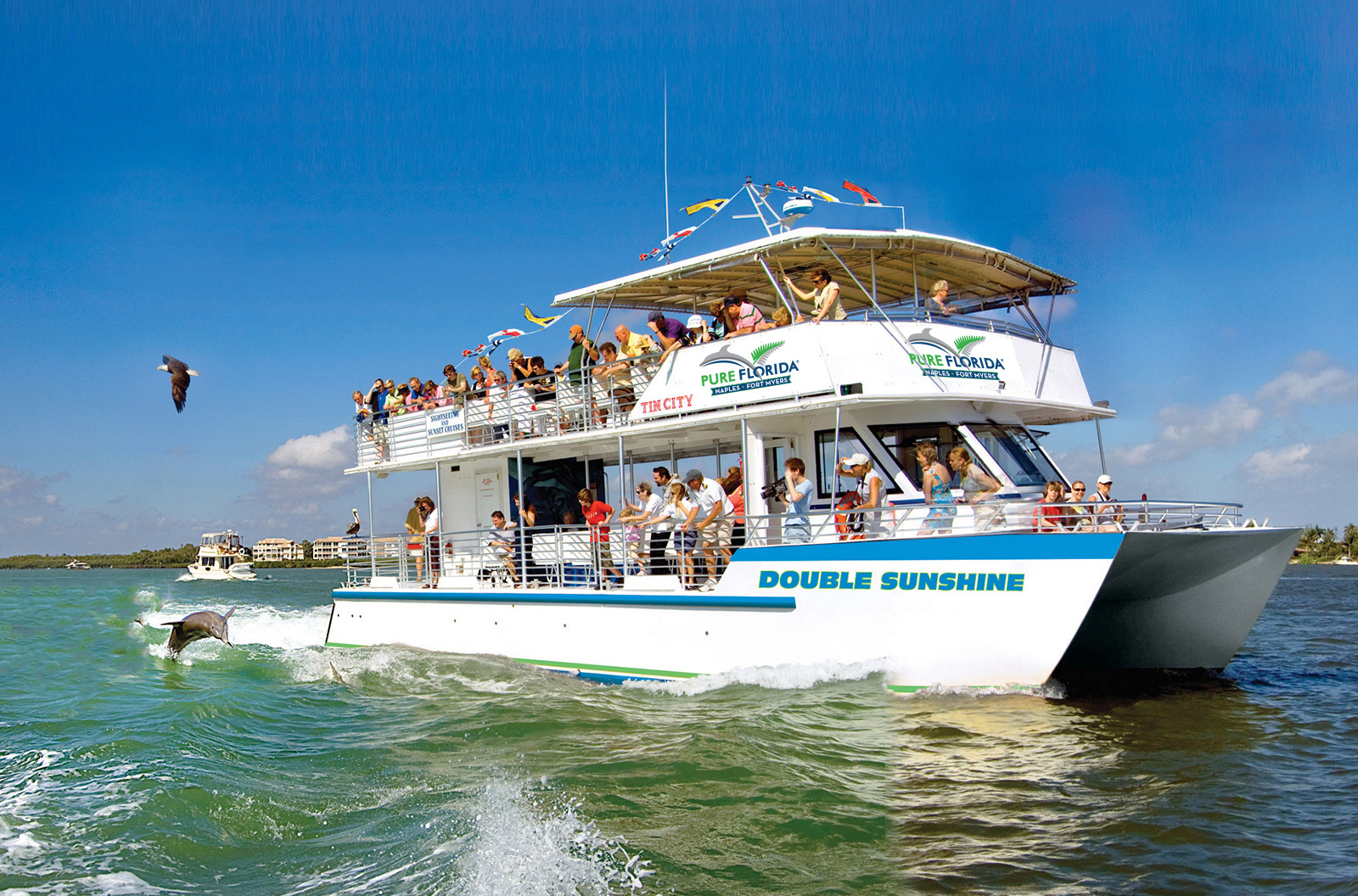 When you board the vessel, get yourself a drink, sit back, relax, and enjoy Naples’ scenery. Our captains will give you a narrated tour of the history of Gordon Pass and the Naples Coastline. Plus you’ll see huge, sprawling, luxurious mansions on Naples Bay. You will hear colorful stories that are the very foundation of Naples’ rich character. There are five, daily 1.5 hour cruises on M/V (Merchant Vessel) Double Sunshine from which to choose. Enjoy the cruise and then explore the shops and restaurants at TIN CITY. Please note: You may or may not see dolphins on this cruise. For rates, departure times, options, or to book a reservation, visit our sightseeing page.